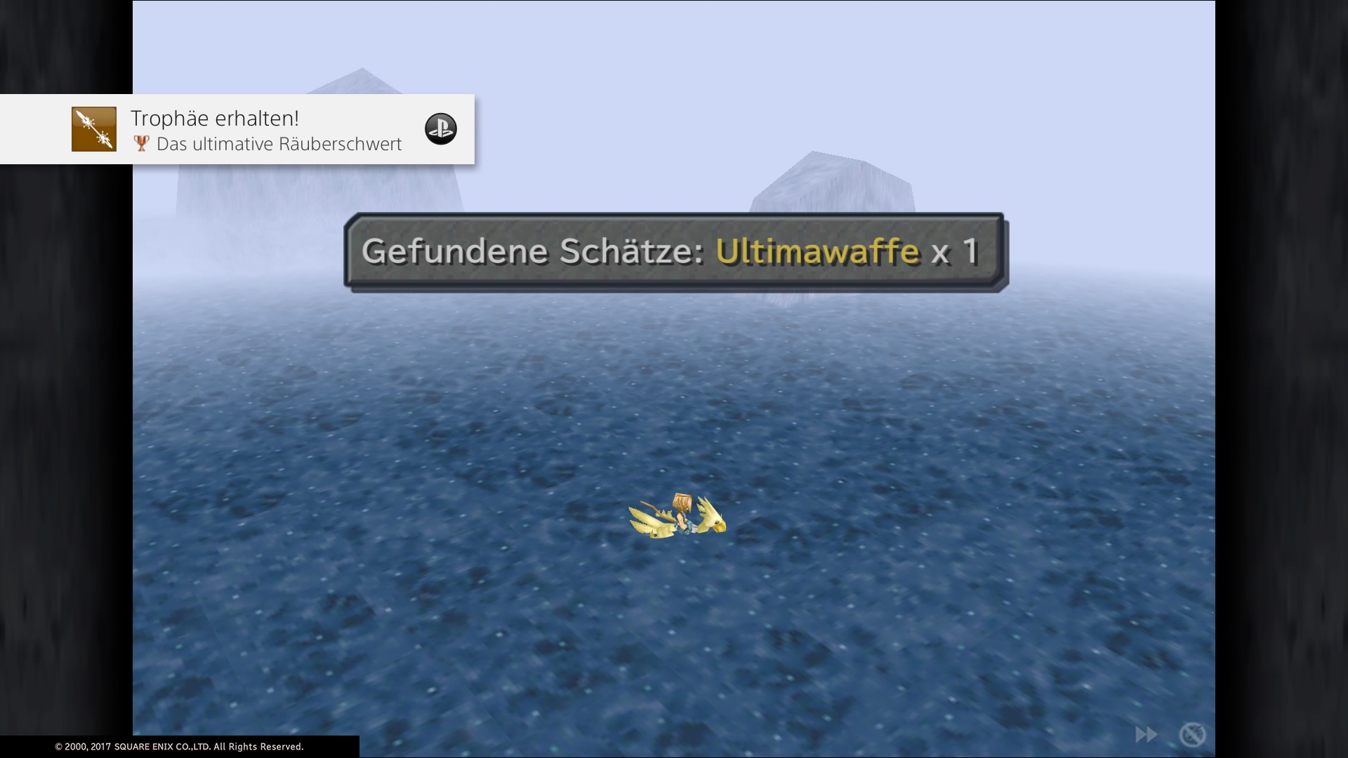 An manchen Stellen der Erde seht ihr im Wasser ein paar Blasen. Dies ist das schäumende Gewässer, setzt ihr hier eine Todesschote ein, gräbt Choco im Meer. Dazu muss er allerdings das dunkelblaue Federkleid erhalten haben. Hier müsst ihr auch mit ein wenig Frust rechnen, denn die richtige Stelle muss genau getroffen werden. Dabei gehen einige Todesschoten drauf bis ihr manche Schätze erhaltet. Für das finden des Schatzes „Schäumendes Gewässer 2“ erhaltet ihr die Trophäe „Ultimativer Stab“. Für „Schäumendes Gewässer 5“ erhaltet ihr die Ultimawaffe und zeitgleich die Trophäe „Ultimatives Räuberschwert“.