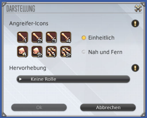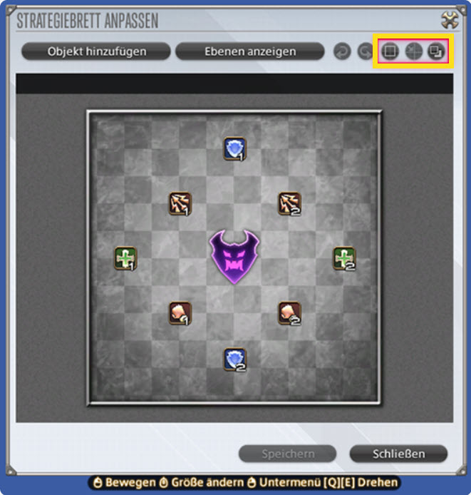 In dieser Liste finden wir alle nötigen Symbole, wie Rollen, Jobs oder Kampfaktionen. Diese lassen sich alle Frei in der Arena platzieren und auch in alle Richtungen drehen. Mittels gedrückter STRG-Taste oder Dreick-Taste (Controller), lassen sich mehrere Objekte markieren und gleichzeitig in der Arena platzieren.