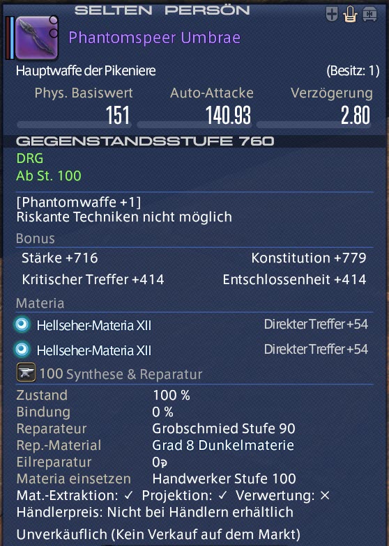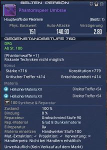 Die Phantomwaffe besitzt jetzt ein Itemlevel von 760, es lassen sich 2 Materia einsetzen und sie besitzt 2 Slots zum Färben.