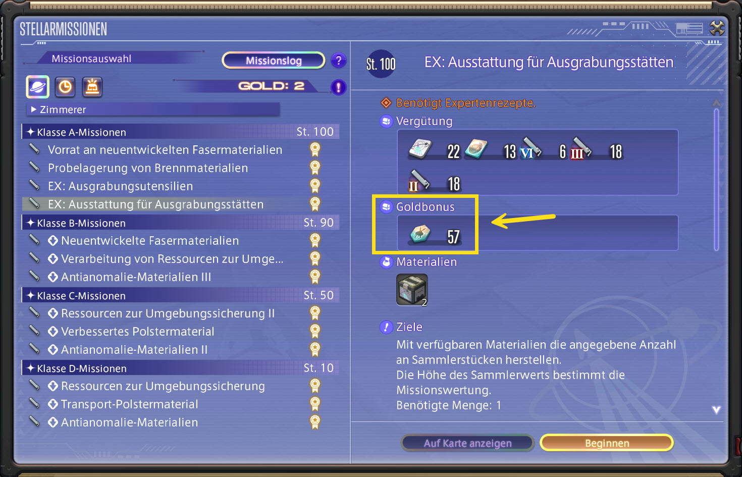 - Schließt zuerst eine z.B. eine Klasse A-Mission mit einer Goldwertung ab, die einen „Goldbonus“ gibt