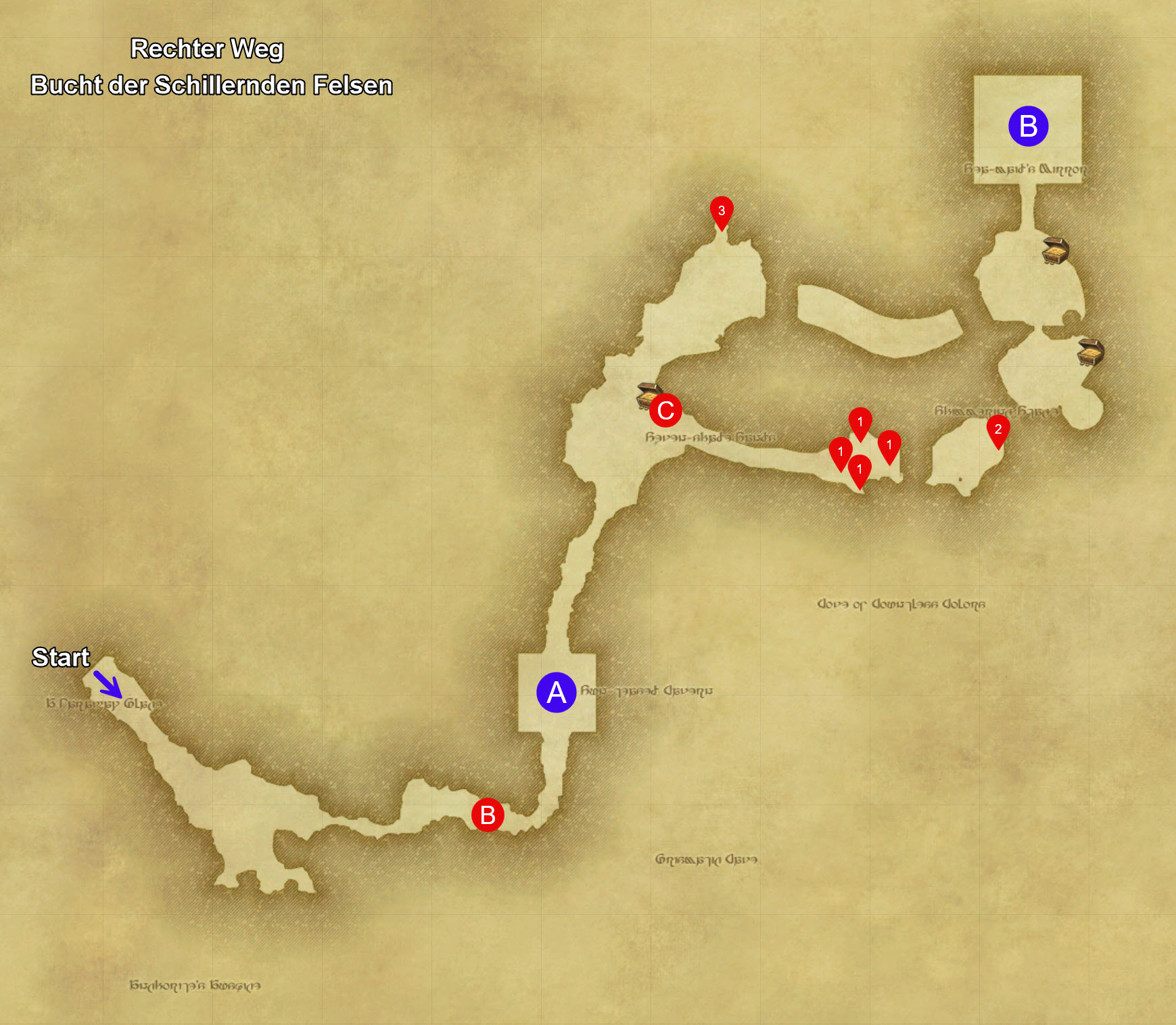 Hinweis: Besiegen wir die Blauen Bomber (B) in der Höhle und sie zerstören Wand auf der rechten Seite, ändert sich eine Mechanik beim Boss.