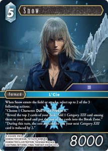 Snow ist ein Stürmer mit dem Element Eis, Kosten von 5 CP, einer Stärke von 8000, dem Job L’Cie und der Kategorie XIII.