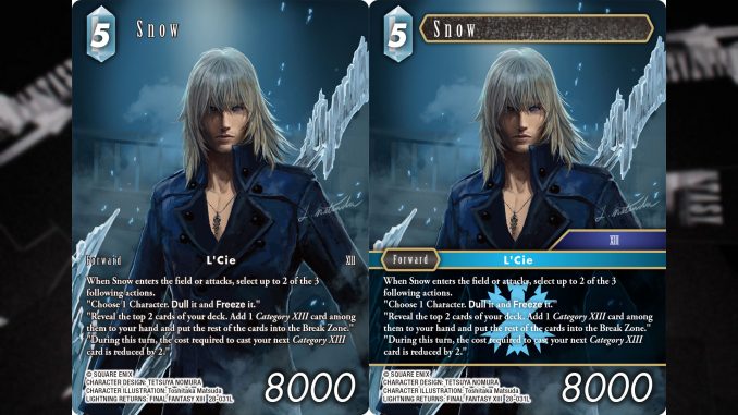 Snow ist ein Stürmer mit dem Element Eis, Kosten von 5 CP, einer Stärke von 8000, dem Job L’Cie und der Kategorie XIII.