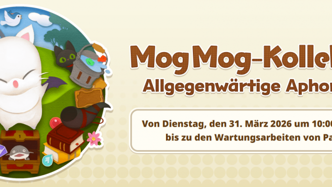 FFXIV: MogMog-Kollektion Allgegenwärtige Aphorismen 24. März 2026 Dee News 0 FFXIV MogMog Allg Apho Banner Dies ist Beitrag 6 von 6 der Serie “FFXIV: Events 2026-2027” Alle FFXIV-Events und Mog Kollektionen für 2026 und 2027 FFXIV: Himmelswende (2026) FFXIV: Gratis-Login-Aktion (Januar 2026) FFXIV: Valentiontag (2026) FFXIV: Das Prinzessinnenfest (2026) FFXIV: Wundereiersuche (2026) FFXIV: MogMog-Kollektion Allgegenwärtige Aphorismen FFXIV: MogMog-Kollektion Allgegenwärtige Aphorismen Ab Dienstag, den 31.03.2026 um 10:00 Uhr MESZ, bis zum Start von Patch 7.5 findet eine neue MogMog-Kollektion in FINAL FANTASY XIV statt. FFXIV MogMog Allg Apho Belohnungen Weitere Details zur MogMog-Kollektion findet ihr auf der Event-Seite. Quelle: FFXIV Lodestone EventFFXIVFinal FantasyFinal Fantasy XIVMogMog KollektionSquare EnixZufrieden mit unseren Artikeln? Dann lasst uns doch einen kleinen Obolus da. Wir würden uns über jede kleine Gabe freuen. Wählt hier bitte immer für Freunde und Familie aus.